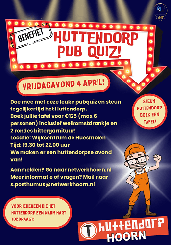 Op vrijdag 4 april organiseren de kinderwerkers van Huttendorp Hoorn een benefietavond om geld in te zamelen voor de komende editie van Huttendorp Hoorn. We willen dit 20-jarige jubileumjaar graag iets extra's doen voor de kinderen en vrijwilligers! Met de opbrengsten van deze benefietavond hopen we al een verschil te kunnen maken.