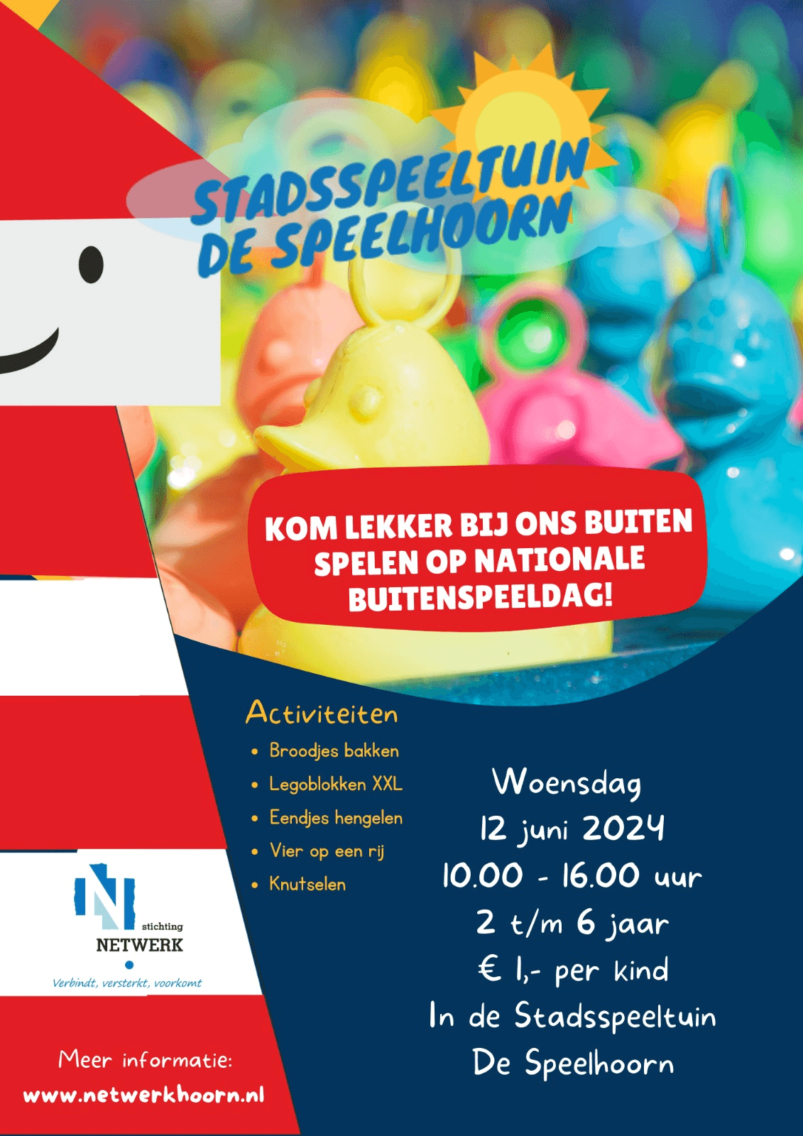 Kinderen van 2 tot 6 jaar kunnen zich (van 10 tot 16.00 uur) uitleven in de stadsspeeltuin De Speelhoorn met broodjes bakken, eendjes hengelen, vier op een rij, knutselen en met extra grote legoblokken. Ook vrij spelen is natuurlijk mogelijk! Kijk in de flyer voor meer informatie.