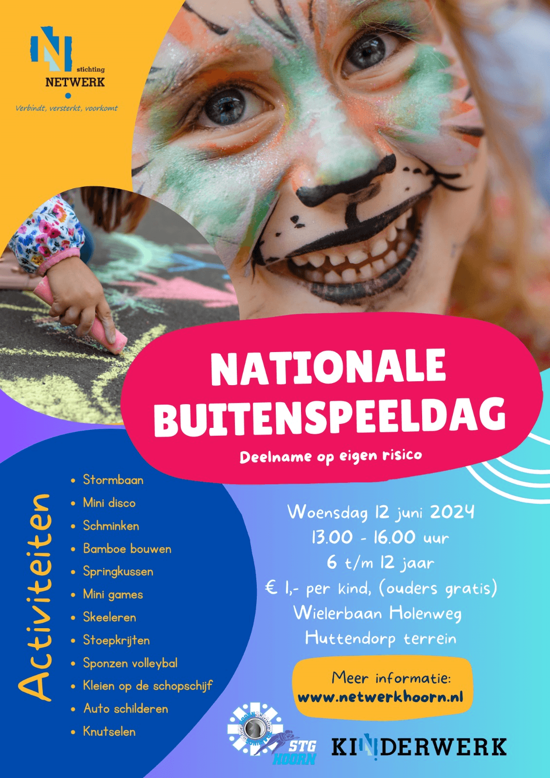 Voor kinderen van 6 tot 12 jaar is de wielerbaan (Holenweg, Huttendorp terrein) van 13 tot 16.00 uur dé plaats om te zijn. Kinderen kunnen genieten van een stormbaan, het springkussen, skeeleren, knutselen, een auto schilderen en nog veel meer! Kijk in de flyer voor meer informatie.