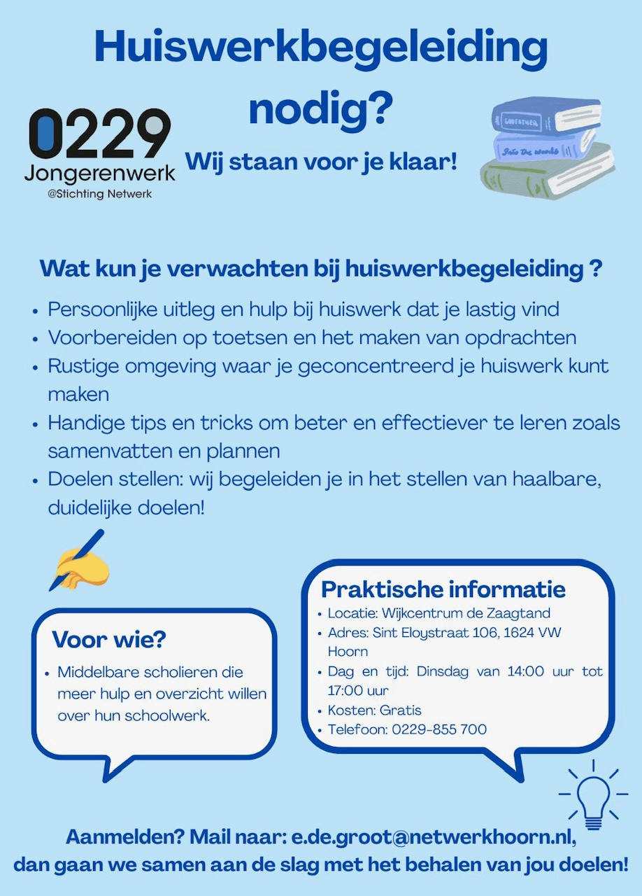 Elke dinsdag en donderdag staan de begeleiders klaar om leerlingen van het voortgezet onderwijs te helpen met hun huiswerk. Dit betekent dat je op een rustige plek je huiswerk kunt maken en krijg je hulp  (indien gewenst) bij het plannen van je huiswerk. Je kunt het hele jaar door deelnemen aan Huiswerkbegeleiding, met uitzondering van de schoolvakanties.