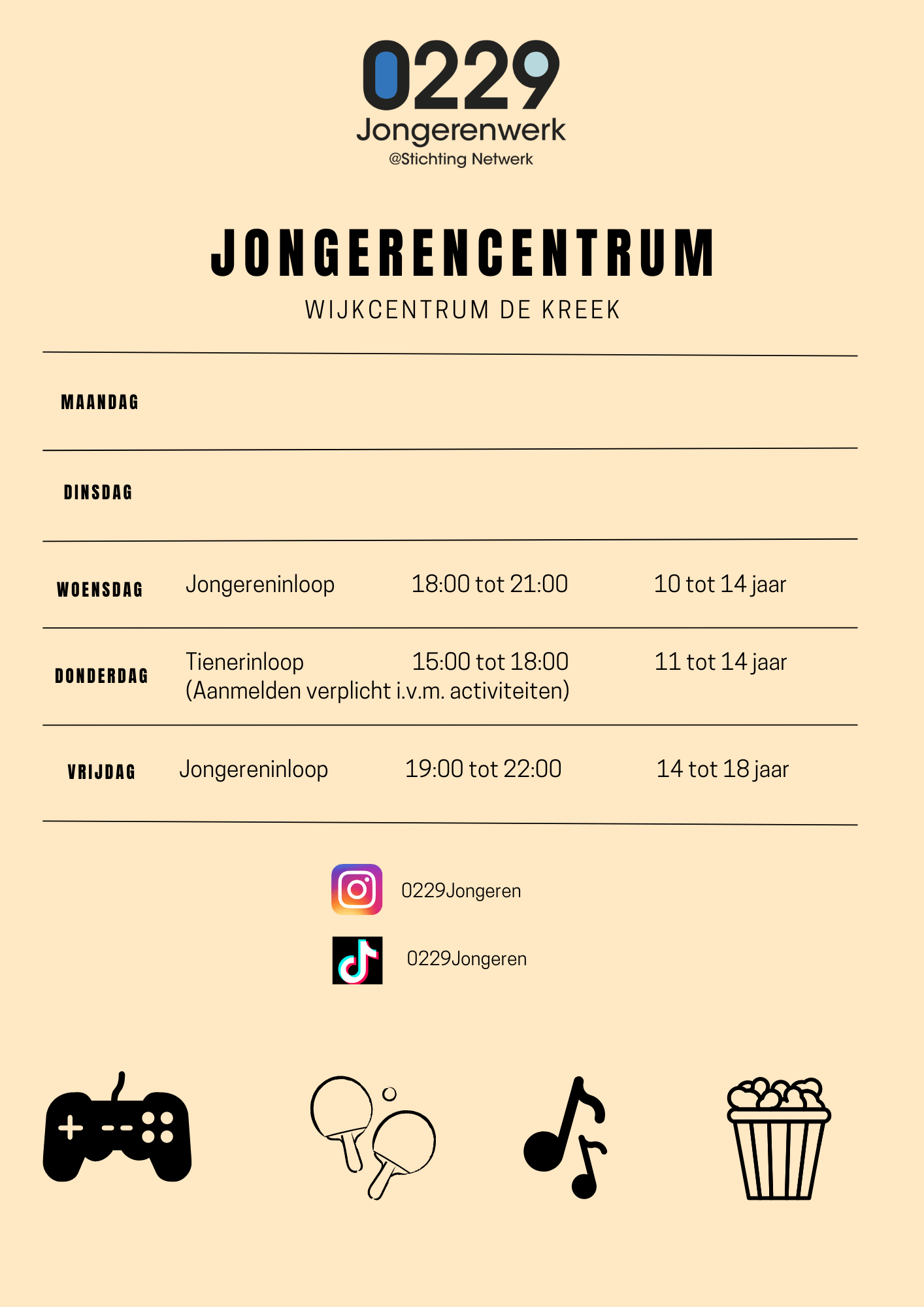 Jongeren tussen de 10 en 14 jaar kunnen elkaar elke woensdag van 18.00 tot 21:00 uur ontmoeten, activiteiten organiseren en praten met de jongerenwerkers over onder andere social media, school, werk en privé.