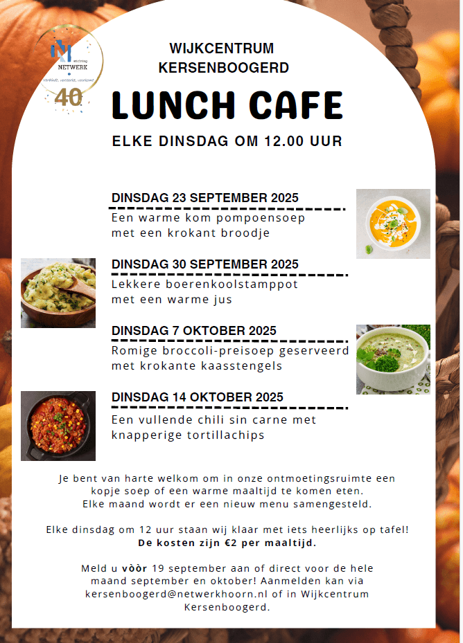 Aanmelden kan via kersenboogerd@netwerkhoorn.nl of meld je aan in wijkcentrum Kersenboogerd.