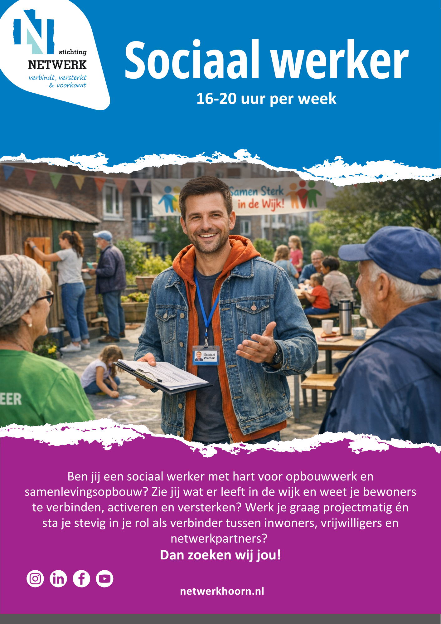 Ben jij de sociaal werker die wij zoeken, stuur dan uiterlijk 3 maart 2026 je CV en je motivatie naar vacature@netwerkhoorn.nl