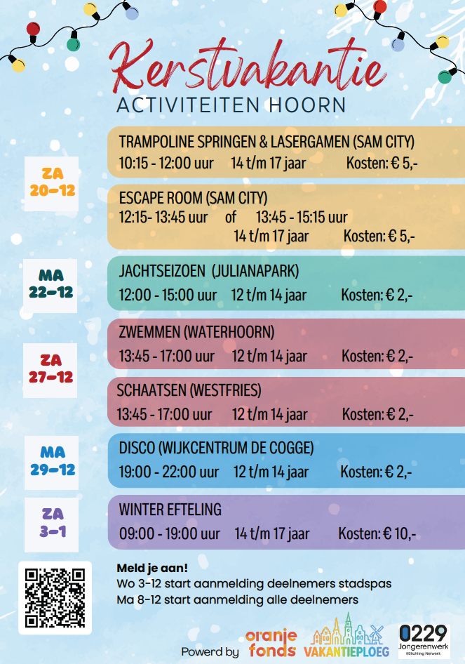 In de kerstvakantie worden er weer vele leuke activiteiten voor jongeren georganiseerd. Denk aan lasergamen, zwemmen, schaatsen en zelfs een bezoek aan de Winter Efteling! Kijk snel in ons programma en meld je aan!
