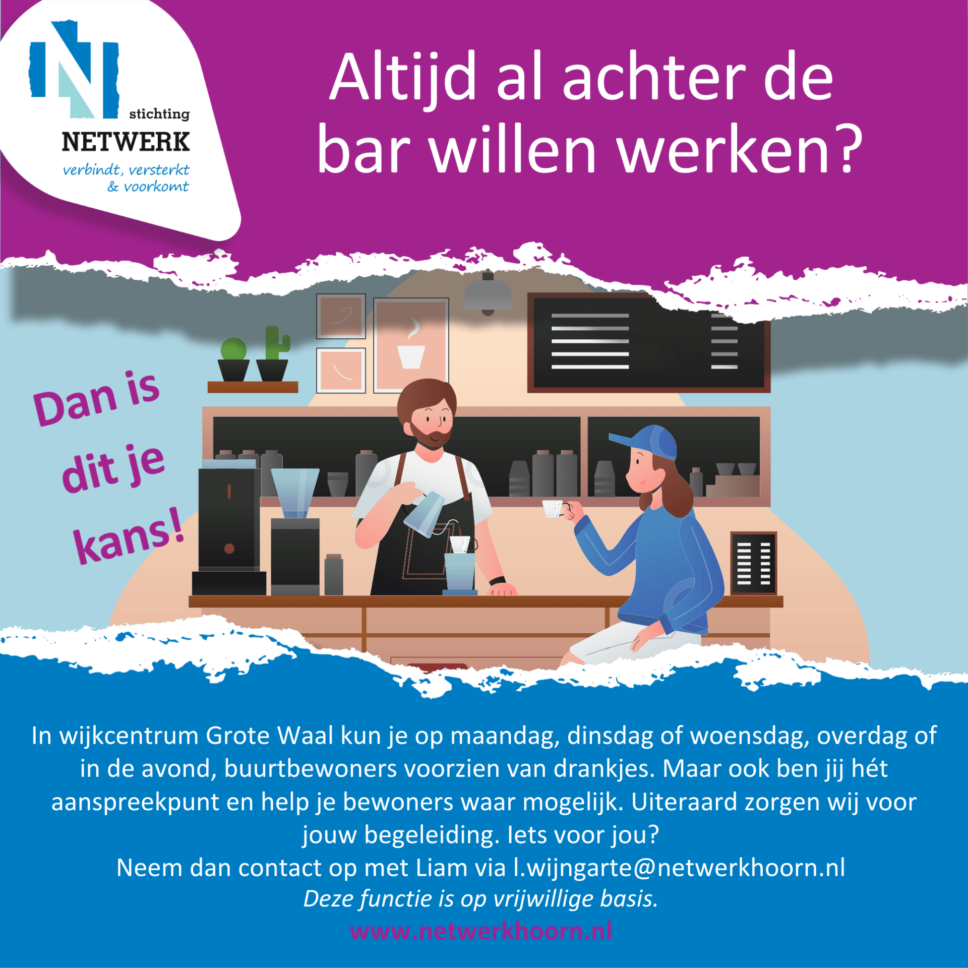 Hou je van gezelligheid, een praatje maken met buurtbewoners en wil je graag het aanspreekpunt zijn in een wijkcentrum? Dan is dit jouw kans! Wijkcentrum Grote Waal is op zoek naar een barvrijwilliger. Wil je meer informatie? Neem dan contact op met zakelijk leider Liam Wijngarte via 0229-280940 of mail naar l.wijngarte@netwerkhoorn.nl.