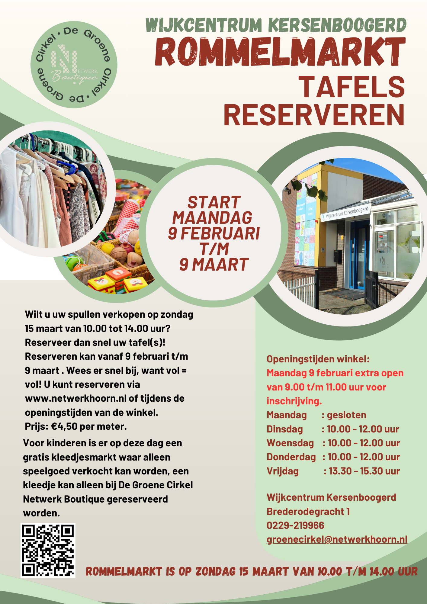 Wil jij een tafel reserveren om je spullen te verkopen? Wees er dan snel bij, want het aantal tafels is beperkt. Je kunt je aanmelden via onze website of kom langs in de tweedehandskledingwinkel De Groene Cirkel Netwerk Boutique in wijkcentrum Kersenboogerd.